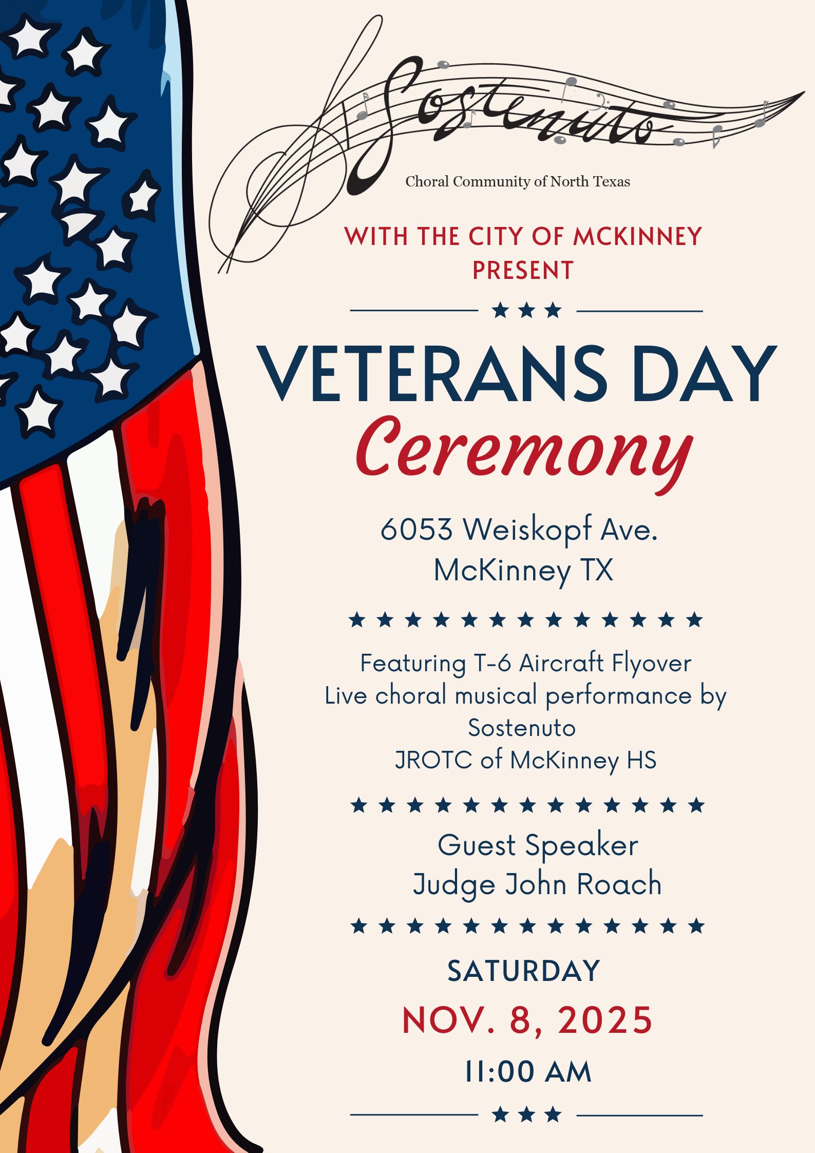 | Description: | Annual Veterans Day Ceremony at the RD Foster Veterans Day Memorial Park in McKinney. Sostenuto provides rousing and moving patriotic music. This year's speaker is the Honorable Judge John Roach. The ceremony culminates with a missing man flyover and the playing of Taps. Come support local Veterans and honor the service of those who paid the ulitmate price. 11:00 a.m., 6053 Weiskopf Ave., McKinney.![]() |